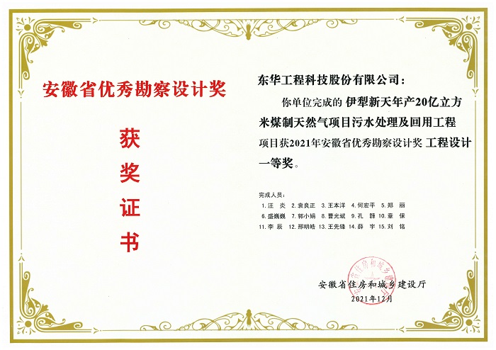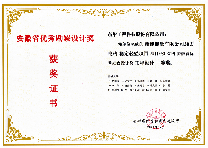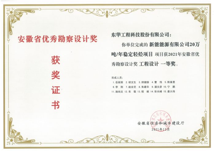 名稱:安徽省優秀勘察設計獎工程設計一等獎