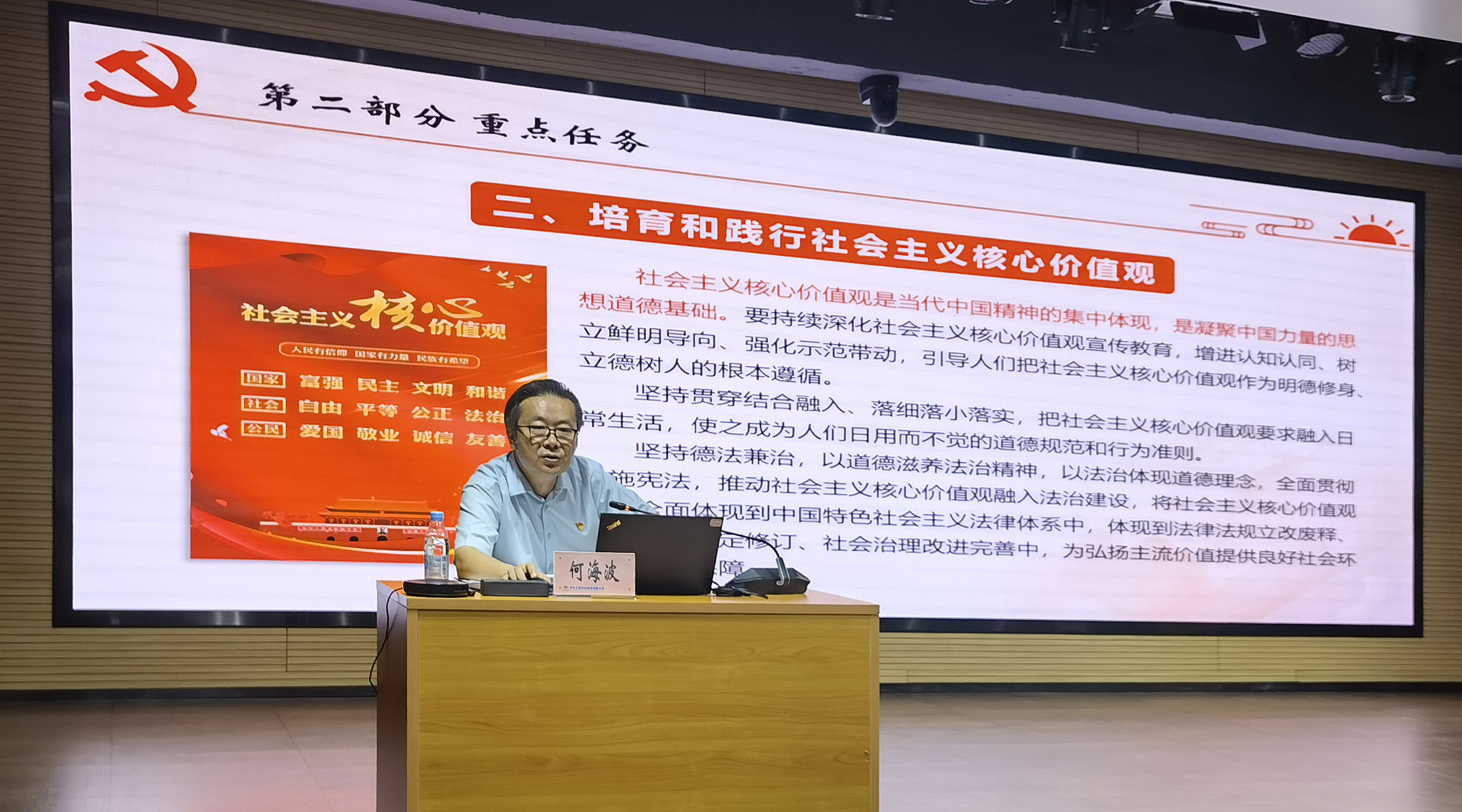何海波結(jié)合新時代要求,深入闡述了《新綱要》出臺的背景意義和主要特點(diǎn),對總體要求、重點(diǎn)任務(wù)、深化道德教育引導(dǎo)、推動道德實(shí)踐養(yǎng)成、抓好網(wǎng)絡(luò)空間道德建設(shè)、發(fā)揮制度保障作用、加強(qiáng)組織領(lǐng)導(dǎo)七個方面具體內(nèi)容進(jìn)行了解讀。他從社會公德、職業(yè)道德、家庭美德、個人品德層面出發(fā),深入淺出地為大家講授了一堂有時代高度、有思想深度、有人文溫度的精神文明教育課。