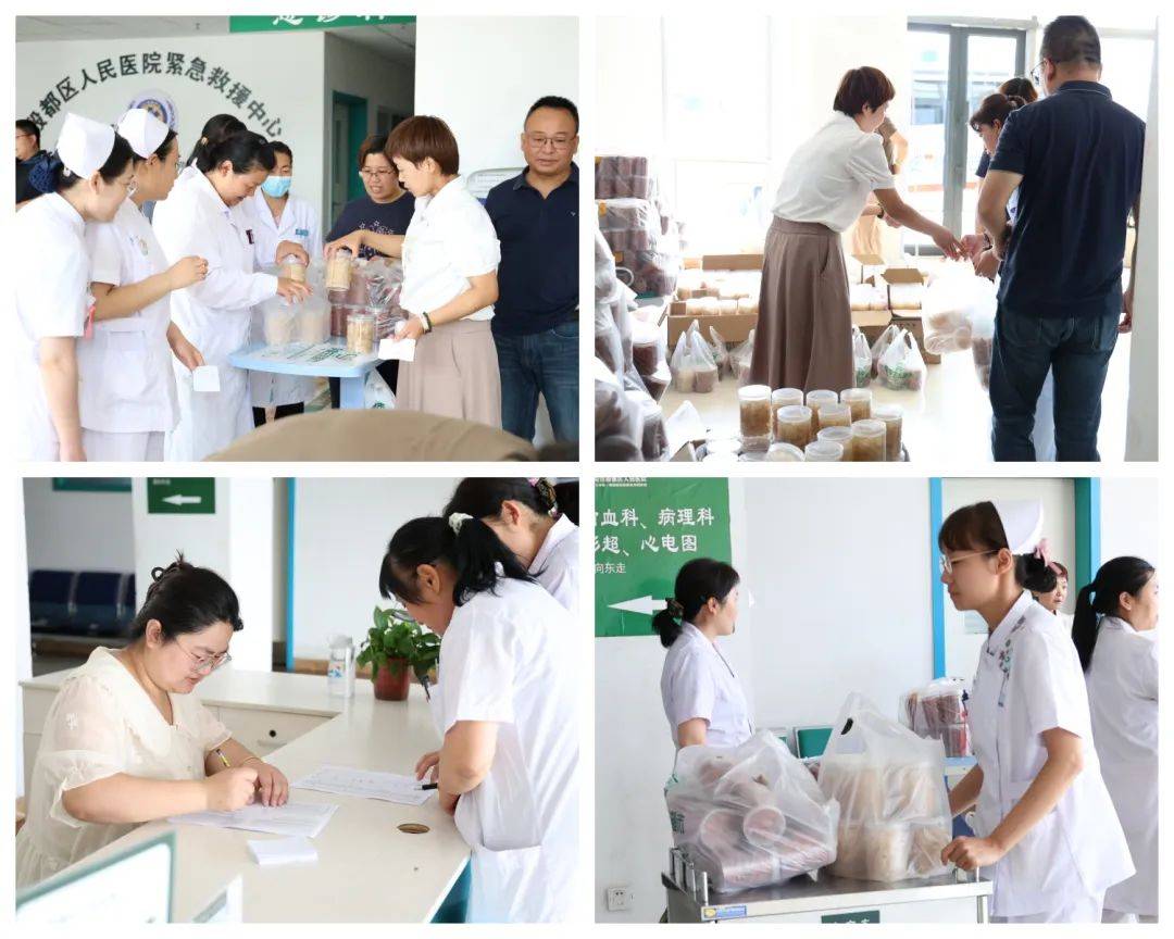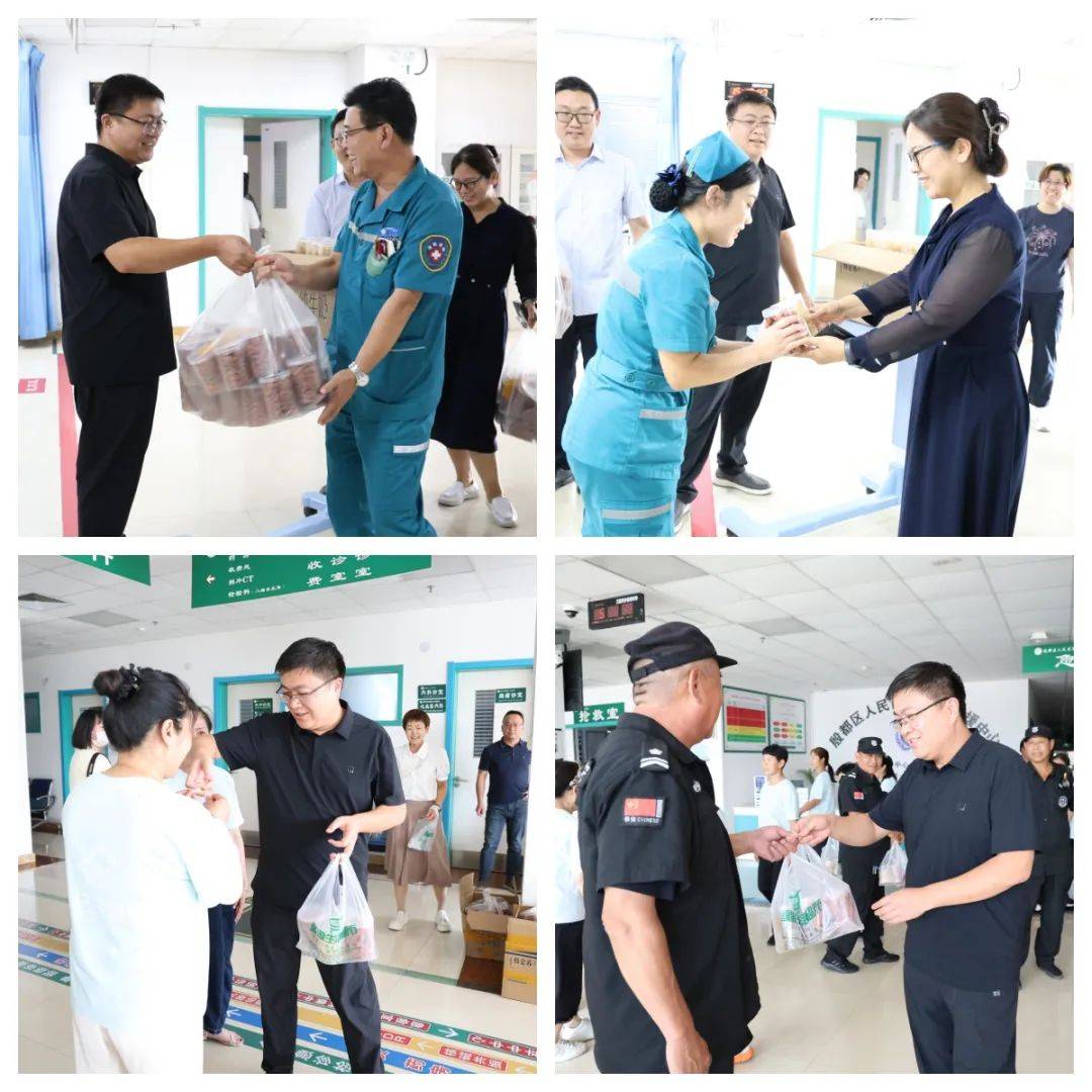發放福利時,黨委書記司曉劍帶領院領導班子成員,將一份份承載著關懷的福利送到一線崗位。在急診大廳,院領導們面帶微笑,將梔子茶和冰糖遞到保安和保潔人員手中,關切地叮囑道:“高溫天堅守崗位太不容易了,一定要注意身體。”走進急診科,他們又向忙碌中的醫護人員表達慰問:“天氣熱,大家辛苦了,多喝點茶降降溫。”
