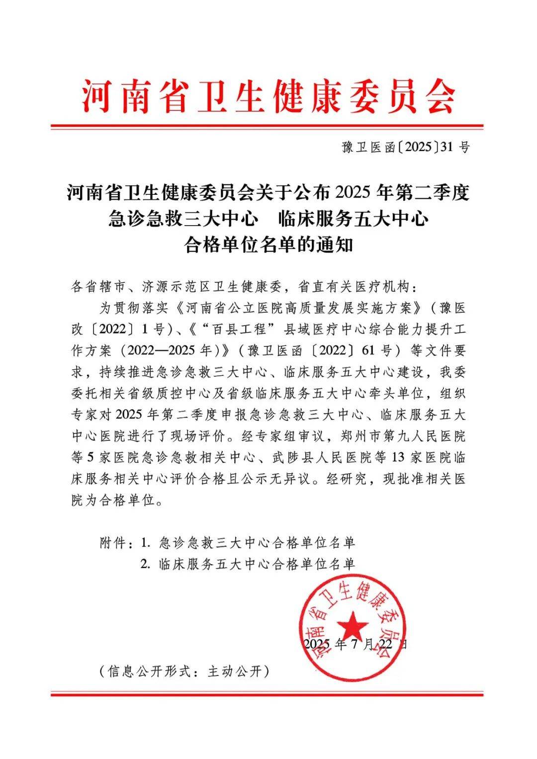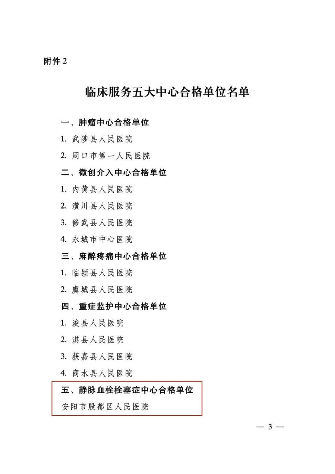 近日,河南省衛生健康委員會印發《河南省衛生健康委員會關于公布2025年第二季度急診急救三大中心、臨床服務五大中心合格單位名單的通知》(豫衛醫函〔2025〕31號),經專家組嚴格審議,安陽市殷都區人民醫院“臨床服務 - 靜脈血栓栓塞癥(VTE)中心”憑借扎實的建設成果達到合格標準,成功通過省級認證。