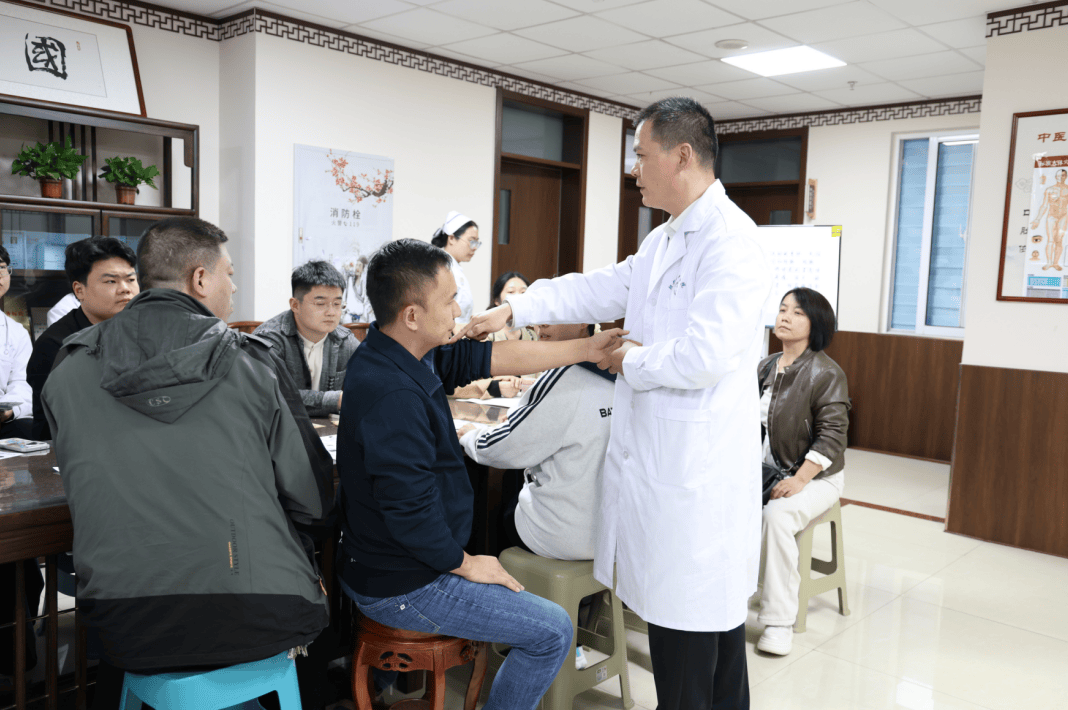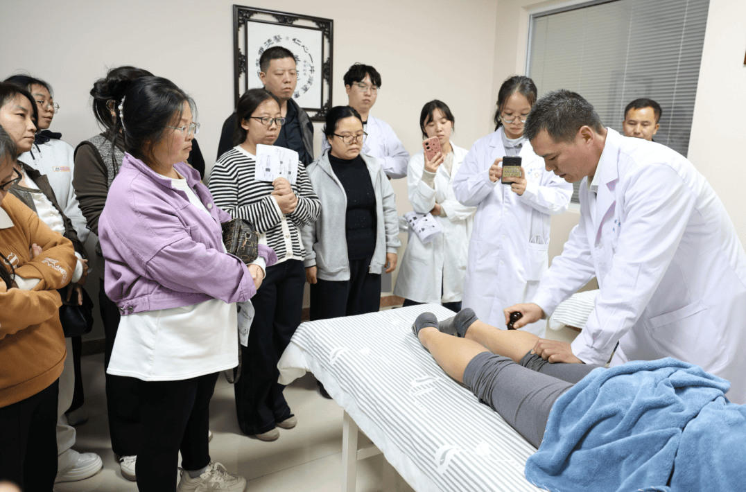 理論講解結束后,培訓轉入實操環節。診室里,張國軍老師現場演示了針對疼痛部位的經筋松解與調理手法。他強調“以指代針、以手為藥”,通過觸診定位筋結、運用推、按、撥、揉等手法進行松解,配合呼吸引導與體位調整,達到“通則不痛”的療效。