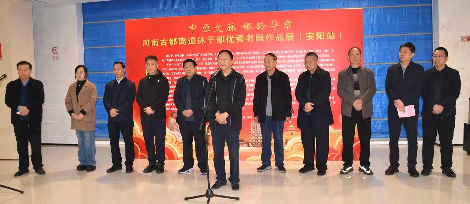 安陽(yáng)市委老干部局副局長(zhǎng)劉覽在開(kāi)展儀式上致辭 :初冬暖陽(yáng)照洹水,筆墨丹青繪華章。今天,我們懷著喜悅的心情,在千年古都安陽(yáng)迎來(lái)“中原文脈 銀齡華章”河南古都離退休干部?jī)?yōu)秀書(shū)畫(huà)作品展的第三站展覽。首先,我謹(jǐn)代表中共安陽(yáng)市委老干部局,向蒞臨本次開(kāi)展儀式的各位領(lǐng)導(dǎo)、各位老同志和嘉賓朋友們,表示熱烈的歡迎!向統(tǒng)籌推進(jìn)本次聯(lián)展的開(kāi)封市委老干部局及四市承辦單位,致以衷心的感謝!向?yàn)楸敬握褂[傾注心血的老藝術(shù)家們,致以崇高的敬意!四市聯(lián)展旨在以藝術(shù)為橋,凝聚銀齡力量、傳承中原文脈。9月15日,主辦城市開(kāi)封市啟幕首展,鄭州站接續(xù)傳遞文化薪火,今日,這抹銀齡藝術(shù)的亮色終于抵達(dá)安陽(yáng)。作為中原文脈不可或缺的重要坐標(biāo),安陽(yáng)既有殷墟甲骨、曹魏高陵的歷史文脈根基,更有紅旗渠精神等新時(shí)代活力。本次參展的230幅作品,正是對(duì)這份“文脈傳承、時(shí)代奮進(jìn)”的最佳詮釋?zhuān)洪_(kāi)封作品盡顯宋都風(fēng)韻,鄭州作品飽含省會(huì)擔(dān)當(dāng),洛陽(yáng)作品深蘊(yùn)神都?xì)庀螅碴?yáng)的50幅佳作則以“甲骨文元素”“紅旗渠精神”“洹新貌”為魂,將老干部們對(duì)家鄉(xiāng)的熱愛(ài)、對(duì)時(shí)代的贊頌融入宣紙之上。各位老同志是安陽(yáng)發(fā)展的見(jiàn)證者、參與者、貢獻(xiàn)者,退休之后以書(shū)畫(huà)為載體,繼續(xù)踐行“退休不褪色、離崗不離黨”的初心。這些作品,不僅是筆墨技巧的展現(xiàn),更是“聽(tīng)黨話(huà)、跟黨走”理想信念的生動(dòng)寫(xiě)照,是“老有所樂(lè)、老有所為”精神風(fēng)貌的鮮活縮影,為全市廣大黨員干部和群眾樹(shù)立了榜樣。在此,我衷心希望各位領(lǐng)導(dǎo)、嘉賓和朋友們,能在本次展覽中感受中原文脈的深厚底蘊(yùn),體會(huì)銀齡藝術(shù)家的赤子情懷;也希望全市廣大離退休干部能以本次展覽為契機(jī),繼續(xù)以藝術(shù)為媒,傳遞正能量、唱響主旋律;更希望四市老干部系統(tǒng)能以本次聯(lián)展為紐帶,深化交流、攜手共進(jìn),讓“中原文脈 銀齡華章”的品牌越辦越好,為河南文化強(qiáng)省建設(shè)貢獻(xiàn)更多銀齡力量!