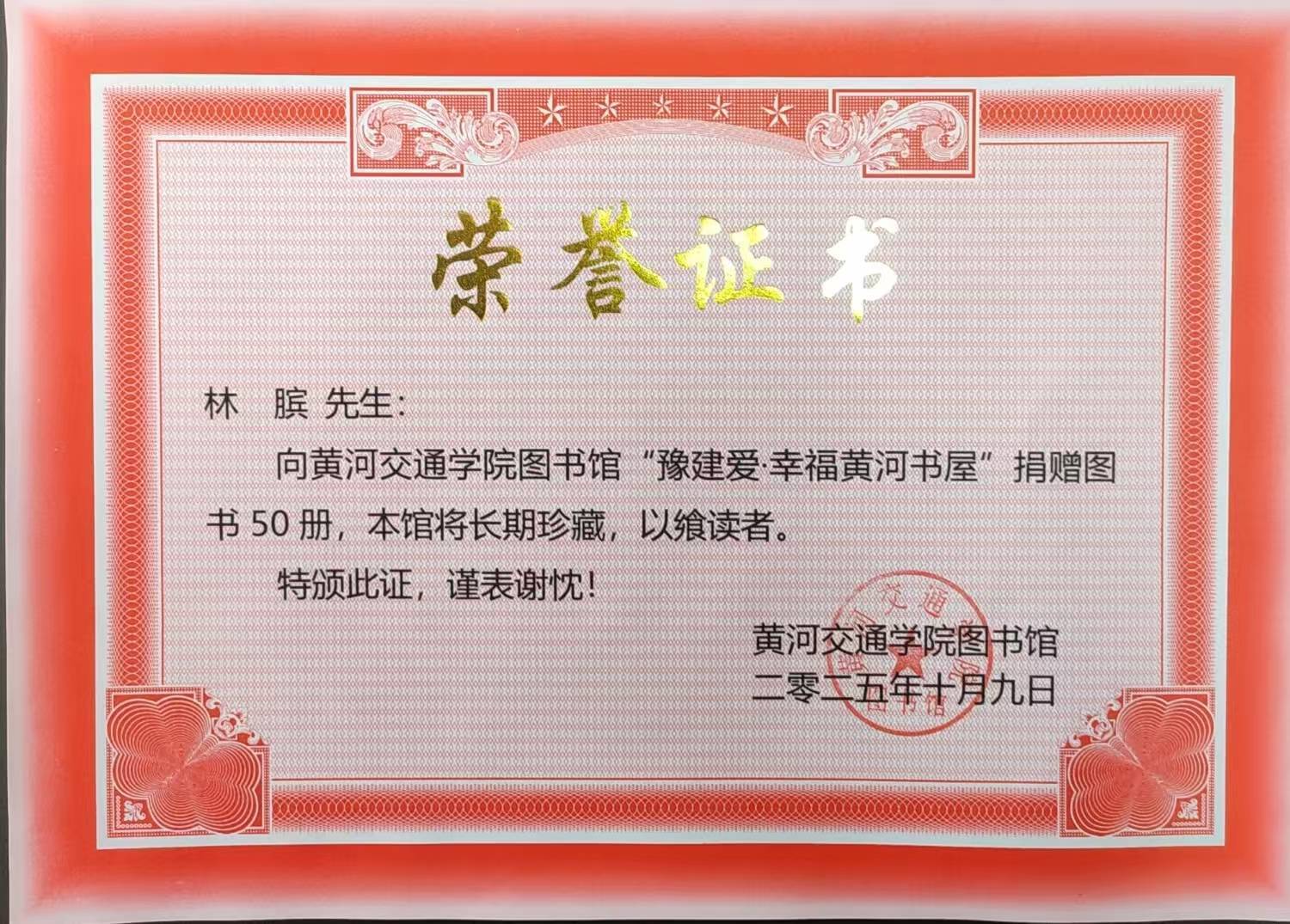 近日,為深入貫徹落實(shí)民建河南省委會(huì)關(guān)于向黃河交通學(xué)院捐助建設(shè)“豫建愛?幸福黃河書屋”工作部署,助力沿黃地市高校建設(shè),中研文化藝術(shù)工作委員會(huì)主席、民建安陽市委會(huì)信息宣傳委員會(huì)主任、北關(guān)區(qū)政協(xié)常委、中大視界文化傳媒產(chǎn)業(yè)(北京)有限公司董事會(huì)主席林臏,向黃河交通學(xué)院捐贈(zèng)50冊精選圖書。此次捐贈(zèng)不僅為青年學(xué)子搭建了優(yōu)質(zhì)閱讀平臺(tái),更以實(shí)際行動(dòng)彰顯了民建會(huì)員的責(zé)任與擔(dān)當(dāng),也展現(xiàn)了中研文化藝術(shù)工作委員會(huì)深耕文化領(lǐng)域、踐行公益初心的使命情懷。黃河交通學(xué)院為林臏頒發(fā)捐贈(zèng)紀(jì)念證書。