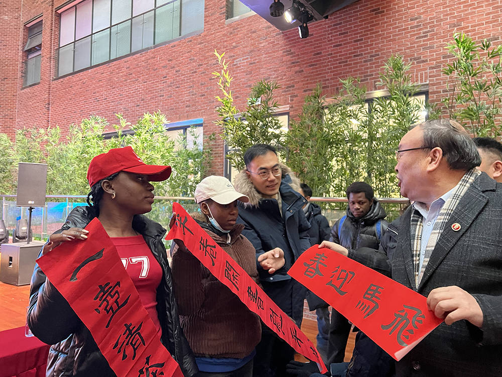 最具有中國人過春節(jié)傳統(tǒng)文化書法藝術(shù)成為全場的壓軸大戲。通過長達(dá)數(shù)十余分鐘組織與天津財(cái)經(jīng)大學(xué)赤道幾內(nèi)亞、貝寧、泰國等外國留學(xué)生和孩子們互動(dòng),酈道元文學(xué)院簽約作家武新才等老師們不僅用精湛的書法當(dāng)場揮毫潑墨寫春聯(lián)福字,還當(dāng)場手把手教留學(xué)生和孩子們?nèi)绾螌懣㈦`、行、草、篆書,普及書法知識(shí)和中國傳統(tǒng)文化,弘揚(yáng)傳統(tǒng)文化藝術(shù),幾名留學(xué)生用毛筆寫出了福字,當(dāng)場展示給觀眾時(shí),全場掌聲雷動(dòng)歡聲笑語,把喜迎新年的聯(lián)歡會(huì)推向高潮,送上提前拜年暖暖的中國年味,感受到傳統(tǒng)文化藝術(shù)美好!