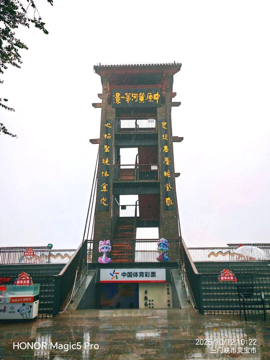 這里是滔滔黃河自西向東經(jīng)潼關(guān)入豫的第一站。母親河以巨龍般的身姿在此劃出一道C形大彎,造就了獨(dú)特的“九曲黃河”景觀。據(jù)說天氣晴好時,靜水區(qū)域泥沙沉淀,河水呈青綠色,與上游的青黃色形成鮮明對比,可觀賞到“半是渾黃半碧玉”與“落日熔金”的奇景。河岸一處海拔500多米的臺塬上,矗立著一座20多米高的明清風(fēng)格觀景臺,四周立著半人多高的不銹鋼護(hù)欄。雖雨霧蒙蒙,但其頂部“中原黃河第一景”七個金色隸書大字,依舊格外奪目。這里本是百里橫嶺觀賞黃河的絕佳之地,平日游人如織,此刻環(huán)顧臺塬,卻唯有我們一行,不見其他半個人影。
