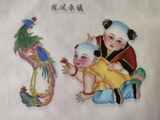 《鳳凰來儀》此圖描繪兩個娃娃在戲逗禽鳥。鳳凰是傳說中的瑞鳥,則有吉祥如意之兆。