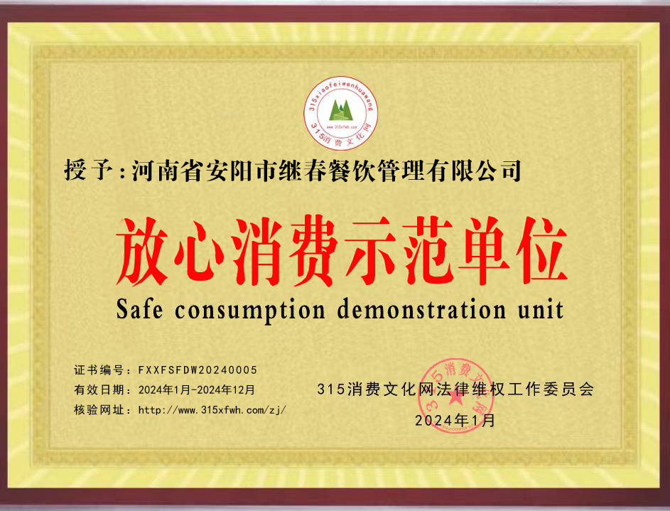 ·熱烈祝賀安陽繼春餐飲管理有限公司被推選為放心消費示范單位2025-02-03