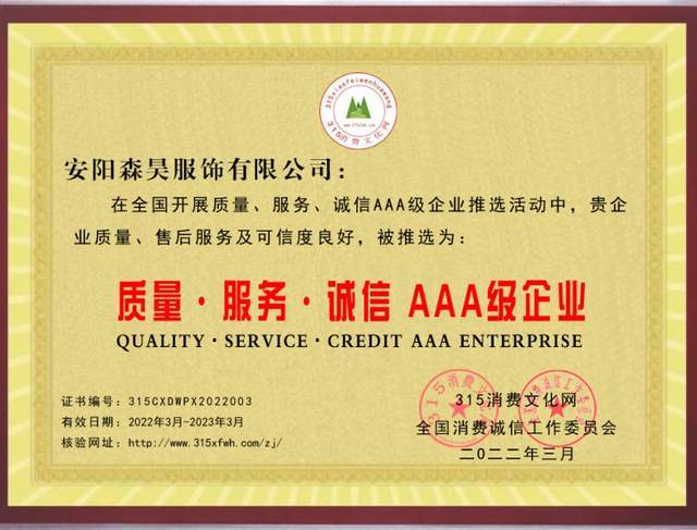 熱烈祝賀安陽市森昊服飾有限公司被評為“全國質(zhì)量、服務(wù)、誠信AAA級企業(yè)”