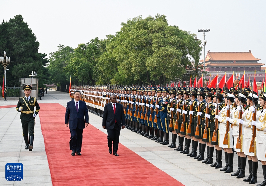 ??恩巴洛抵達(dá)時,禮兵列隊致敬。兩國元首登上檢閱臺,軍樂團(tuán)奏中國和幾內(nèi)亞比紹兩國國歌,天安門廣場鳴放21響禮炮。恩巴洛在習(xí)近平陪同下檢閱中國人民解放軍儀仗隊,并觀看分列式。