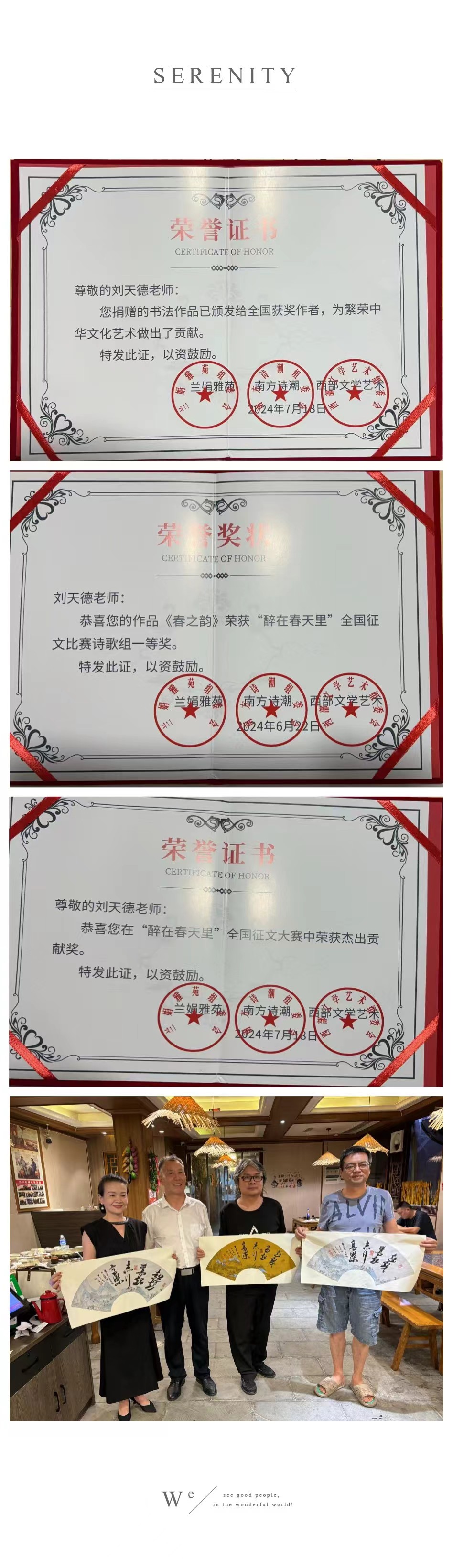劉天德,筆名:光磊,大學本科學歷,歷任安徽省界首市公安局機關黨委書記、局指揮中心臺長、局文聯主席、四級高級警長,中國酈道元文學院副院長、中華現代文化促進會副主席,安徽省、全國公安作家協會會員,《中國現代文化報》副總編。先后在國家、省、市報刊雜志發表詩文500余篇,其中30余篇獲大獎。先后入選《中華大地之光》《共和國之盾》等刊物,正式出版長篇小說《愛情日記》《警徽閃爍》《高墻內的女人》《父愛》(文學電影劇本)4部,均獲國家著作權專利。第三屆酈道元文學大賽一等獎、第五屆中國優秀作家。最近又榮獲第二屆世界華人文學獎?中國年度獎——《高墻下的女人》(長篇小說)、優秀電影劇本獎——《父愛》(文學劇本)、第六屆中國當代實力派書畫名家等。第四屆酈道元文學大賽榮獲金獎。