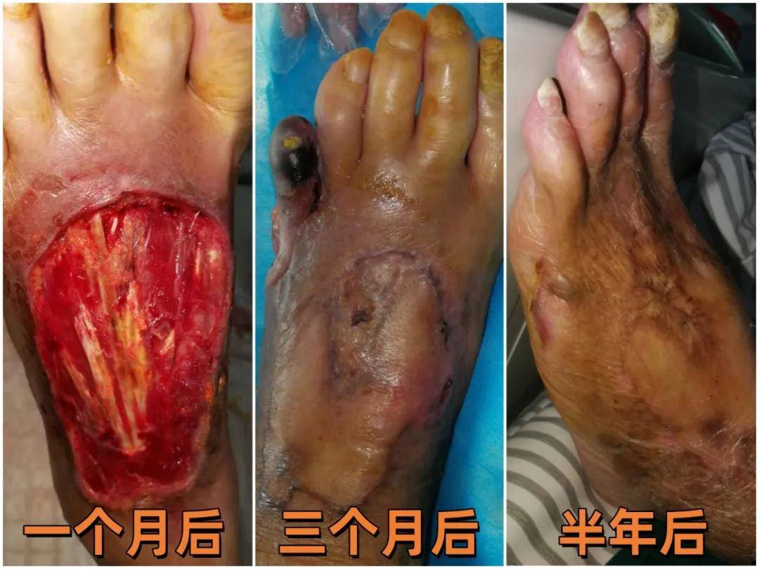 80歲的劉大爺患2型糖尿病10年,因足背燙傷未及時就診,導致皮膚、皮下組織壞死。遂到殷都區人民醫院內分泌腎病科入院治療。醫生為其做了詳細的檢查,診斷為:糖尿病足病3級。給予清除壞死組織、中藥化腐生肌等治療。創面清潔后給予植皮、定期清潔創面、換藥等治療。通過醫護團隊細致地清創、換藥,去除壞死組織、控制感染,劉大爺的足背 創面得到有效愈合。