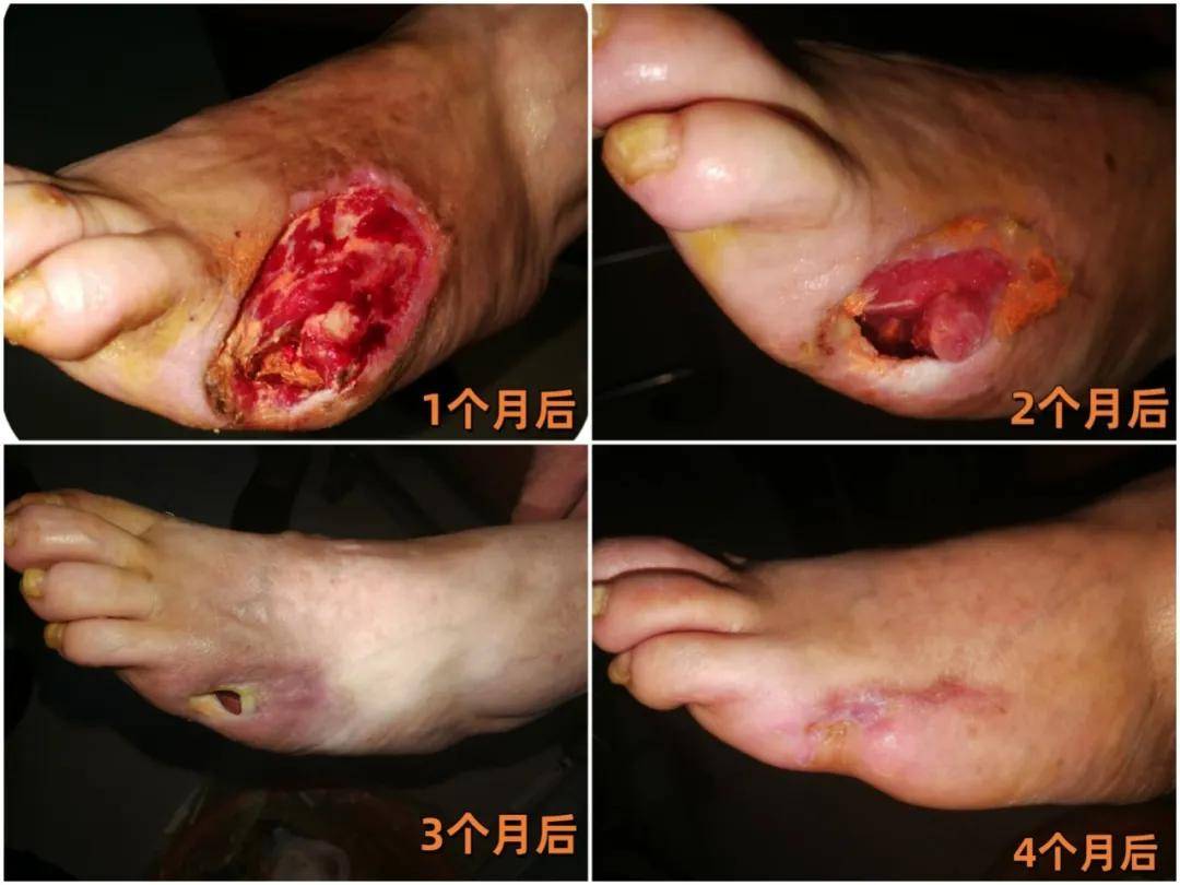 經醫生完善檢查,患者診斷為:糖尿病足病4級、局部壞疽。 結合其病史及身體狀況,醫生給予清創及截取壞死組織,并進一步給予蠶食清創、中藥化腐生肌等治療。經過醫護團隊的精心治療與護理,李奶奶的足部感染破潰得以逐漸愈合。