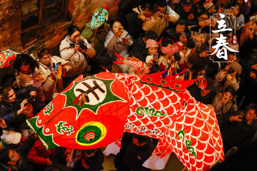??↑安徽省黃山市歙縣北岸鎮(zhèn)的瞻淇魚燈表演隊在村中嬉游祈福,迎接新年。CICPHOTO/施亞磊 攝