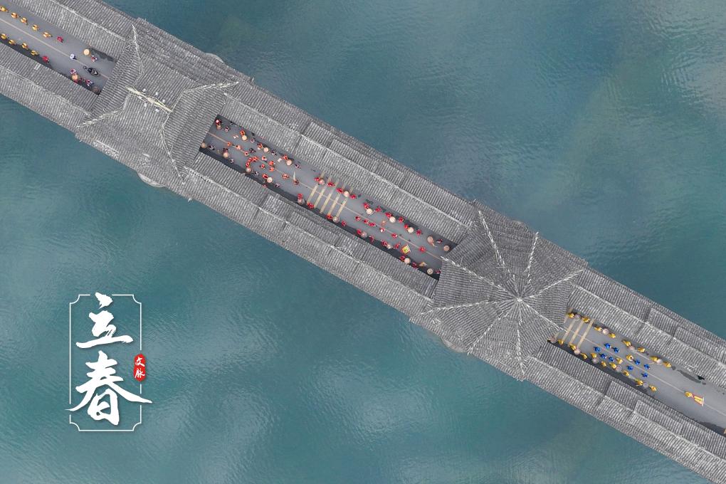 ??↑貴州省銅仁市玉屏侗族自治縣的民間藝人在風雨橋上進行表演。(無人機照片)CICPHOTO/胡攀學 攝