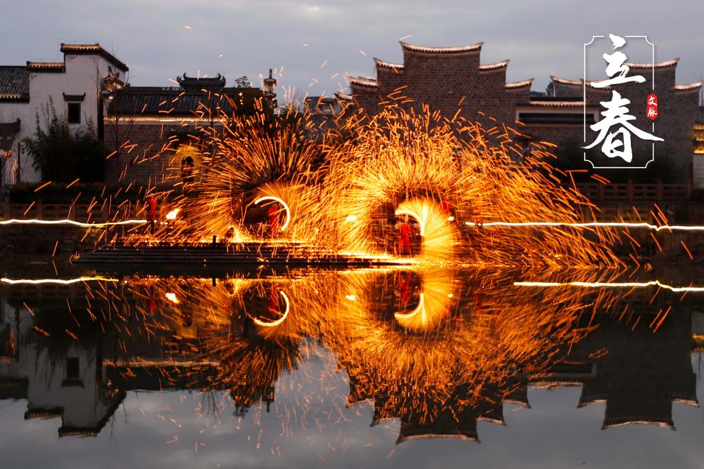 ??↑安徽省蕪湖市的民間藝人在鳩茲古鎮(zhèn)表演打鐵花。CICPHOTO/陳效寶 攝