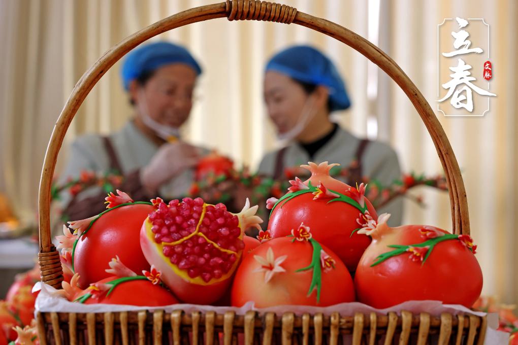 ??↑山東省棗莊市的民間藝人在制作“紅石榴”喜饃。CICPHOTO/吉喆 攝