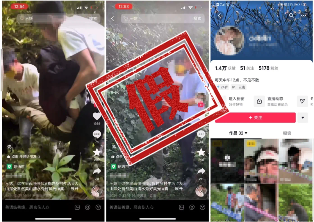 “婆媳勢(shì)不兩立”“婚姻一地雞毛”等以家庭矛盾為中心、以沖突為賣(mài)點(diǎn)的網(wǎng)絡(luò)虛假擺拍視頻并不鮮見(jiàn),此類視頻往往密集制造沖突,放大家庭矛盾,且臺(tái)詞夸張、情節(jié)曲折。8月28日,抖音發(fā)布近期介入核實(shí)的網(wǎng)絡(luò)虛假擺拍典型案例,博主“是老王家的二姐呀”自稱在14歲至20歲期間被父母包辦3次婚姻,16歲時(shí)就和“大自己30歲的男子”生下兒子,并與幾個(gè)自稱“三妹”“大姐”的賬號(hào)互動(dòng)頻繁,以矩陣賬號(hào)合力擺拍造假。涉事賬號(hào)被平臺(tái)采取封禁處理。10月,貴州畢節(jié)市七星關(guān)區(qū)網(wǎng)警與山東青島市網(wǎng)警先后通報(bào)“外來(lái)媳婦遭嫌棄毆打趕出家門(mén)后,躲進(jìn)山洞艱苦求生”“臨盆孕婦被丈夫遺棄荒山數(shù)日,孤立無(wú)援,無(wú)法下山求救”兩起虛假擺拍案例,相關(guān)涉案人員均被當(dāng)?shù)鼐浇o予行政處罰。